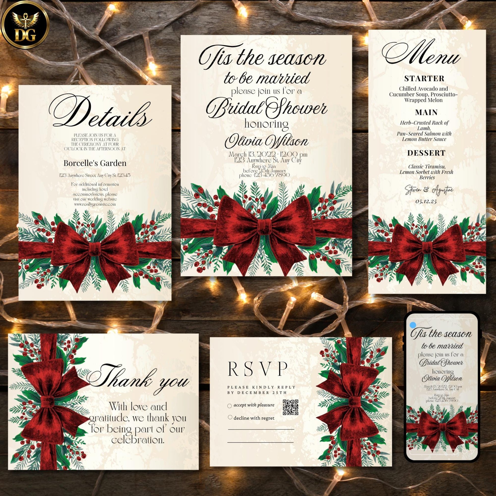 'Tis The Season to Be Married Christmas Bridal Shower Bundle – Luxe Velvet Red Bow, Evergreen & Berries, Cream Gold, Canva Editable, Printable + Digital