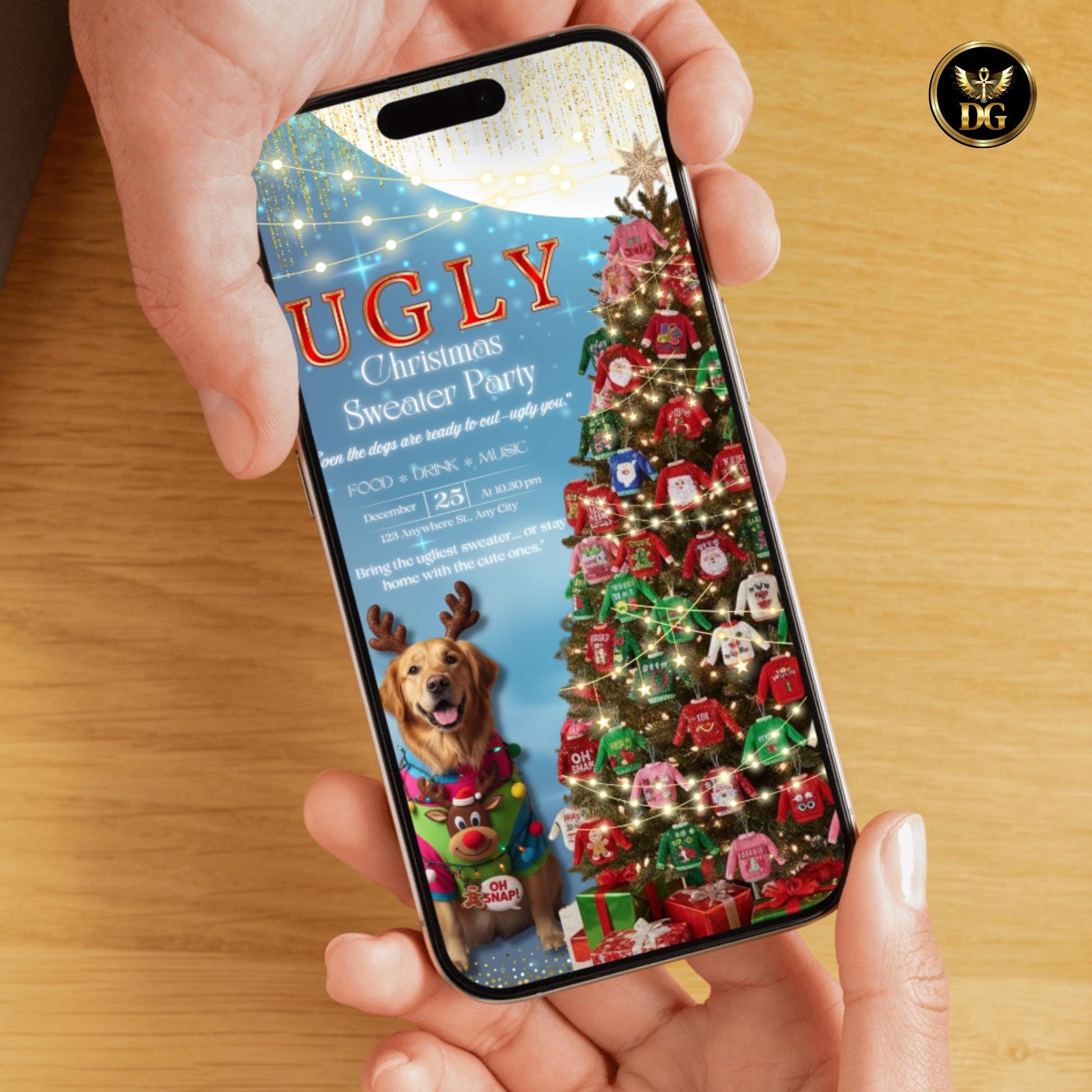 Looking for a fun and festive Christmas party invitation? Our Ugly Christmas Sweater Party template features adorable dog-themed design with the hilarious message "Even the dogs are ready to out-ugly you!" This instant digital download is perfect for your holiday celebrations, office parties, family gatherings, or friend get-togethers.