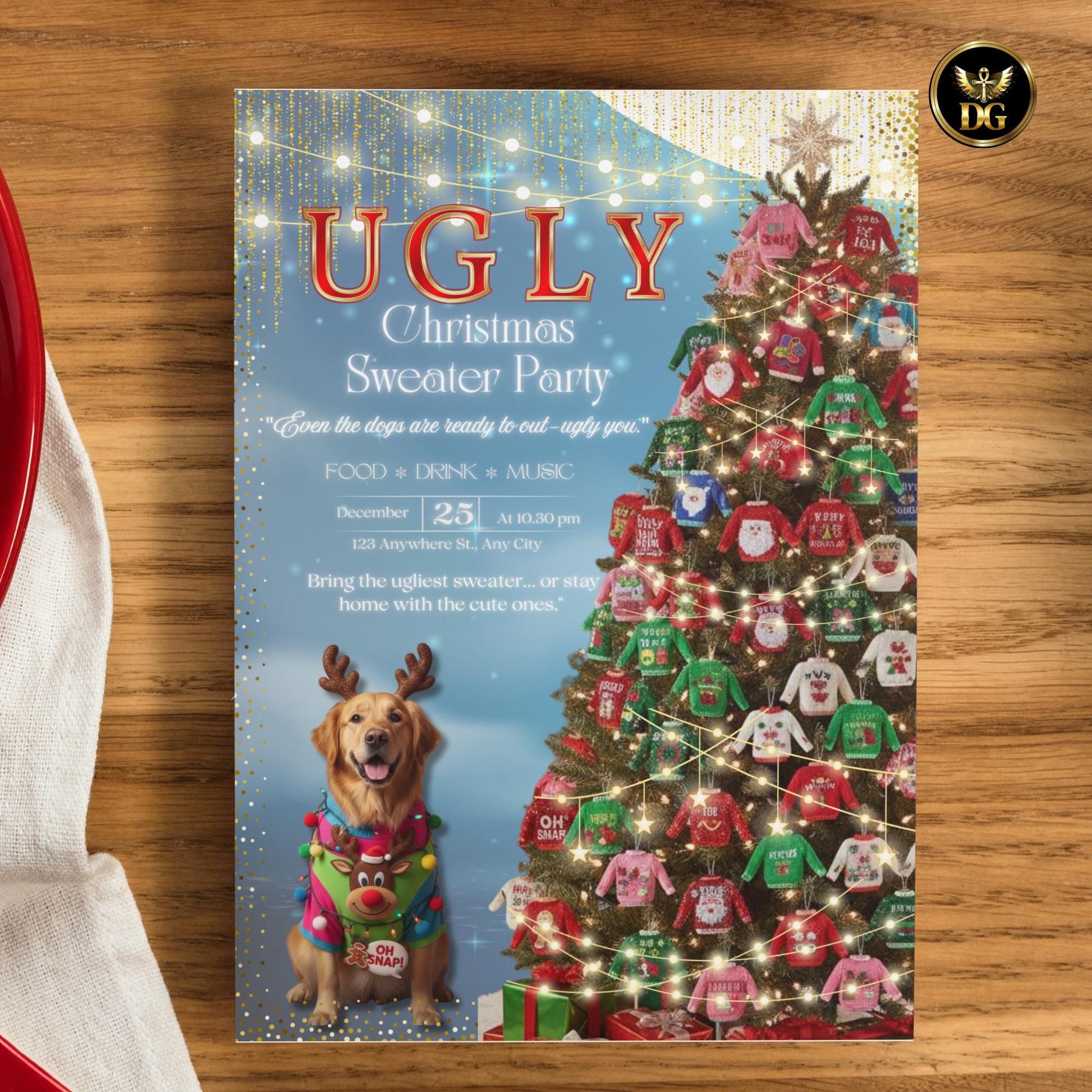 Ugly Christmas Sweater Party Invitation Template - Editable Digital Download - Holiday Party Invite - Christmas Dog Design