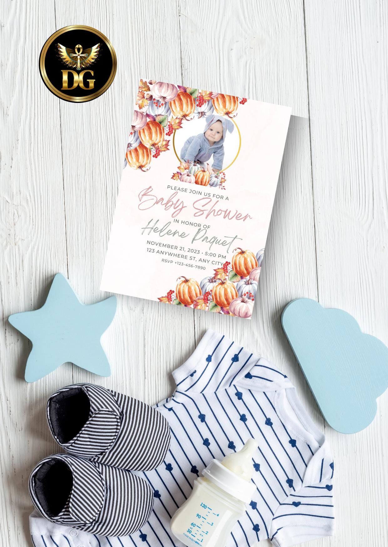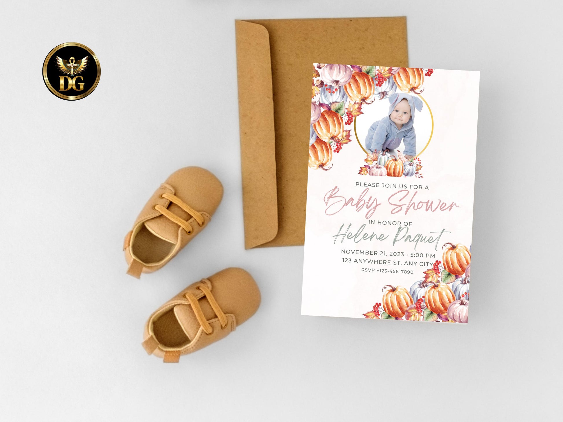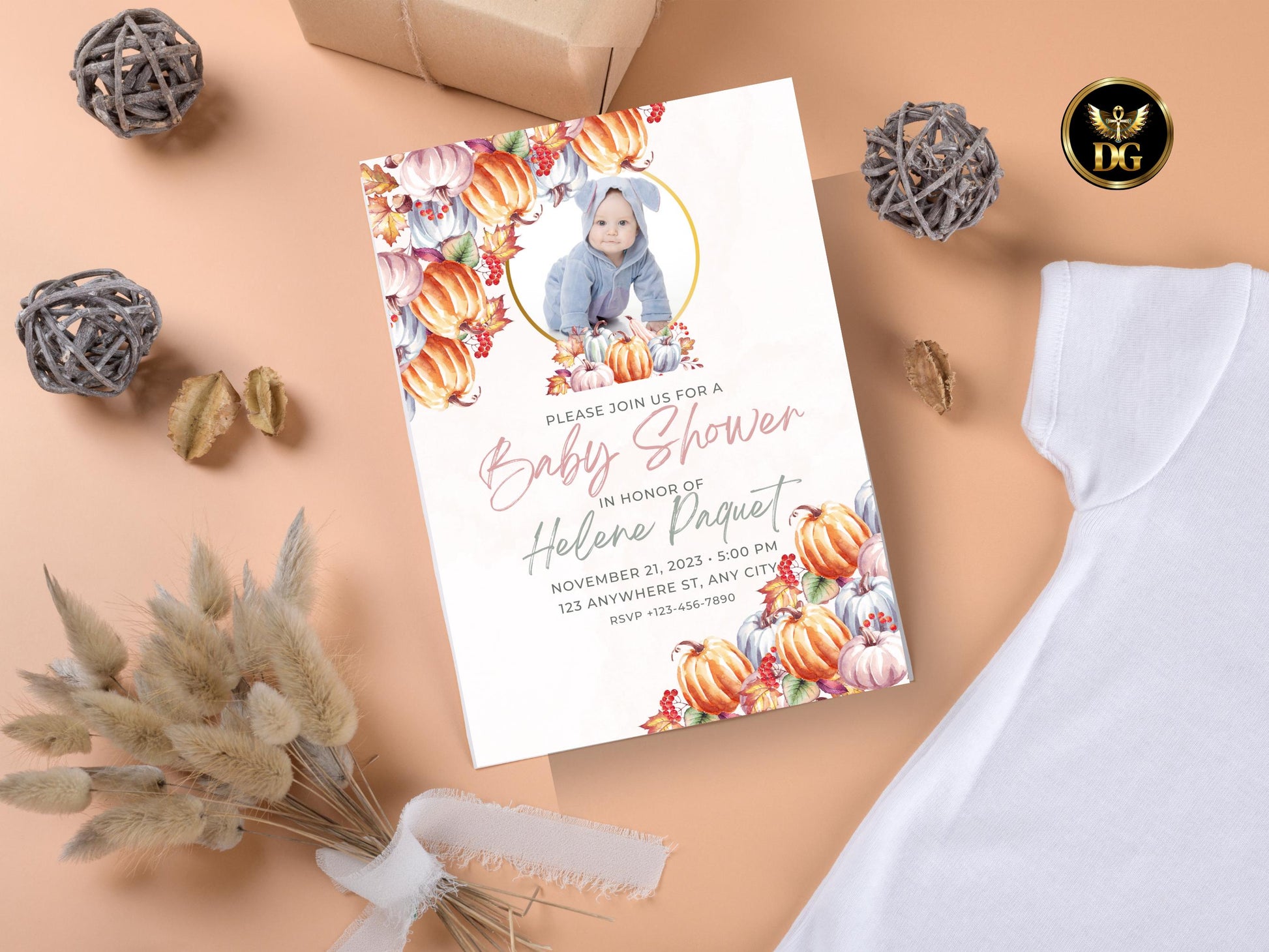 Invite your guests to a warm and cozy celebration with this adorable fall-themed baby shower invitation, now 50% off for a limited time! This design features a beautiful watercolor pumpkin border in soft shades of orange, blush, and white. The editable template includes a special photo frame for you to add a picture of the baby or mom-to-be, making it a truly personal keepsake.