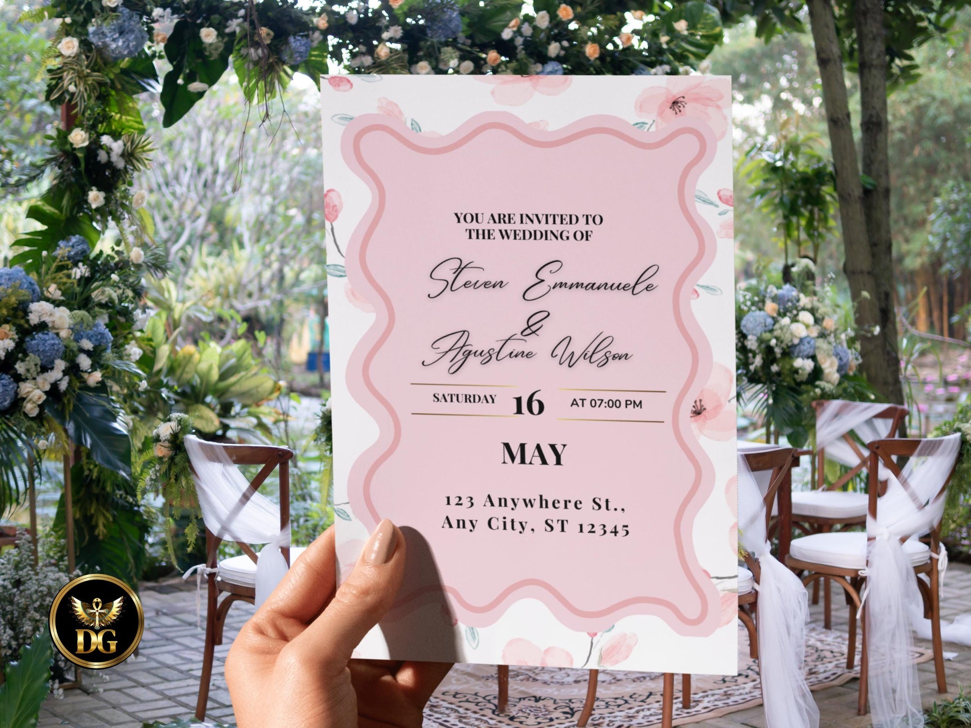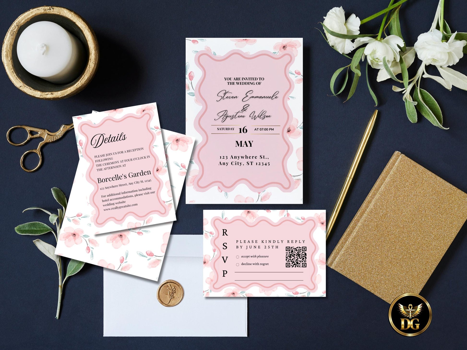 Wave Label Wedding Invitation Template Set Pink Floral Wedding Invitation Template Download, Editable Modern Wedding Invite Instant Download
