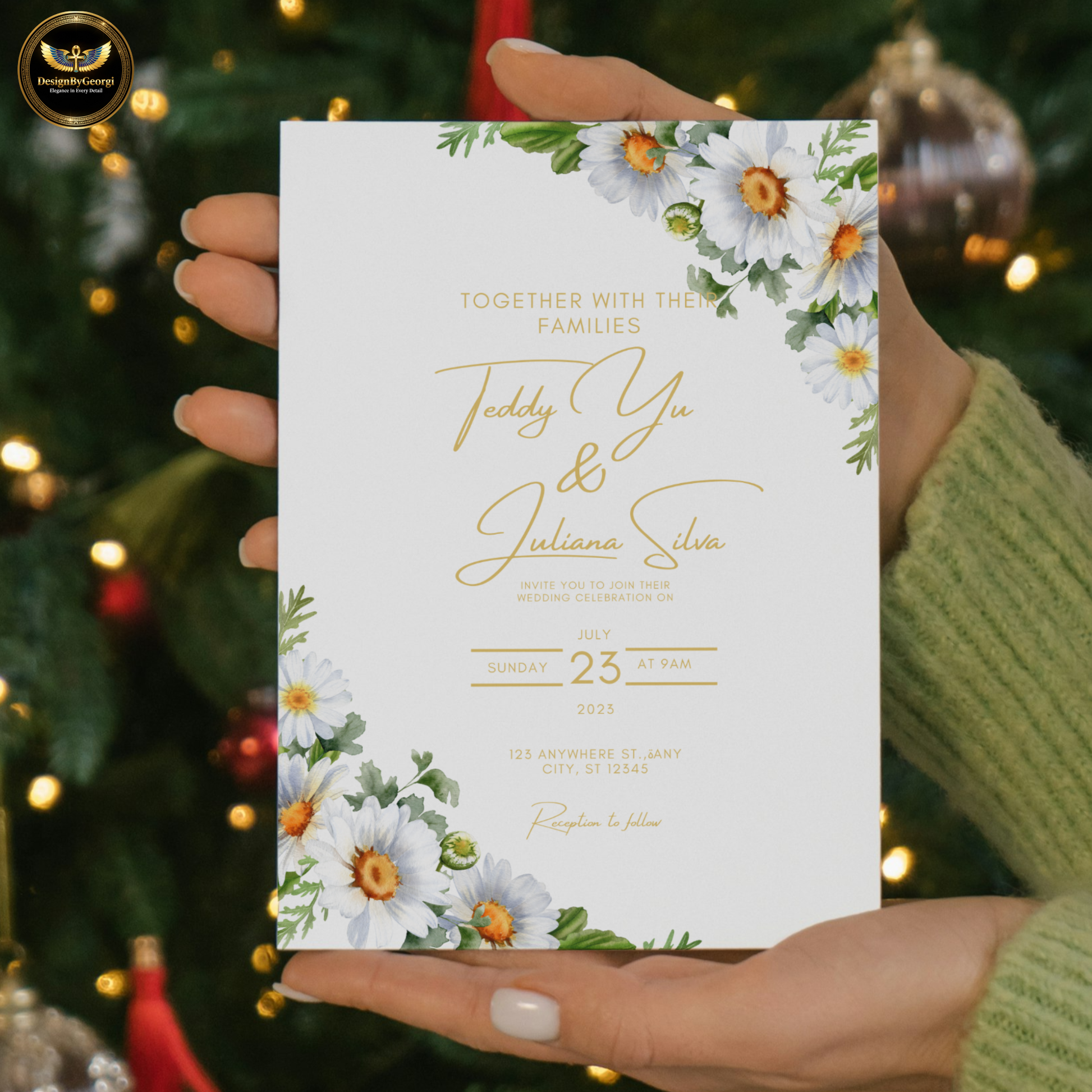 Main Wedding Invitation: 5x7 inches + digital size 1080x1920px – Crisp white background, elegant daisy in the corner, minimal design.