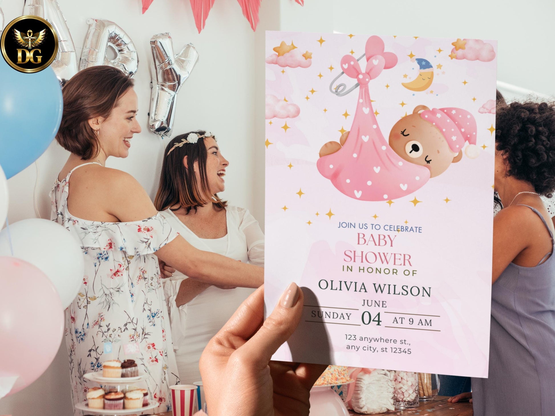 Celebrate the arrival of a little one with this adorable baby shower invitation! Featuring a cute bear in a pink floral design with stars, moons, and clouds, this digital download is perfect
