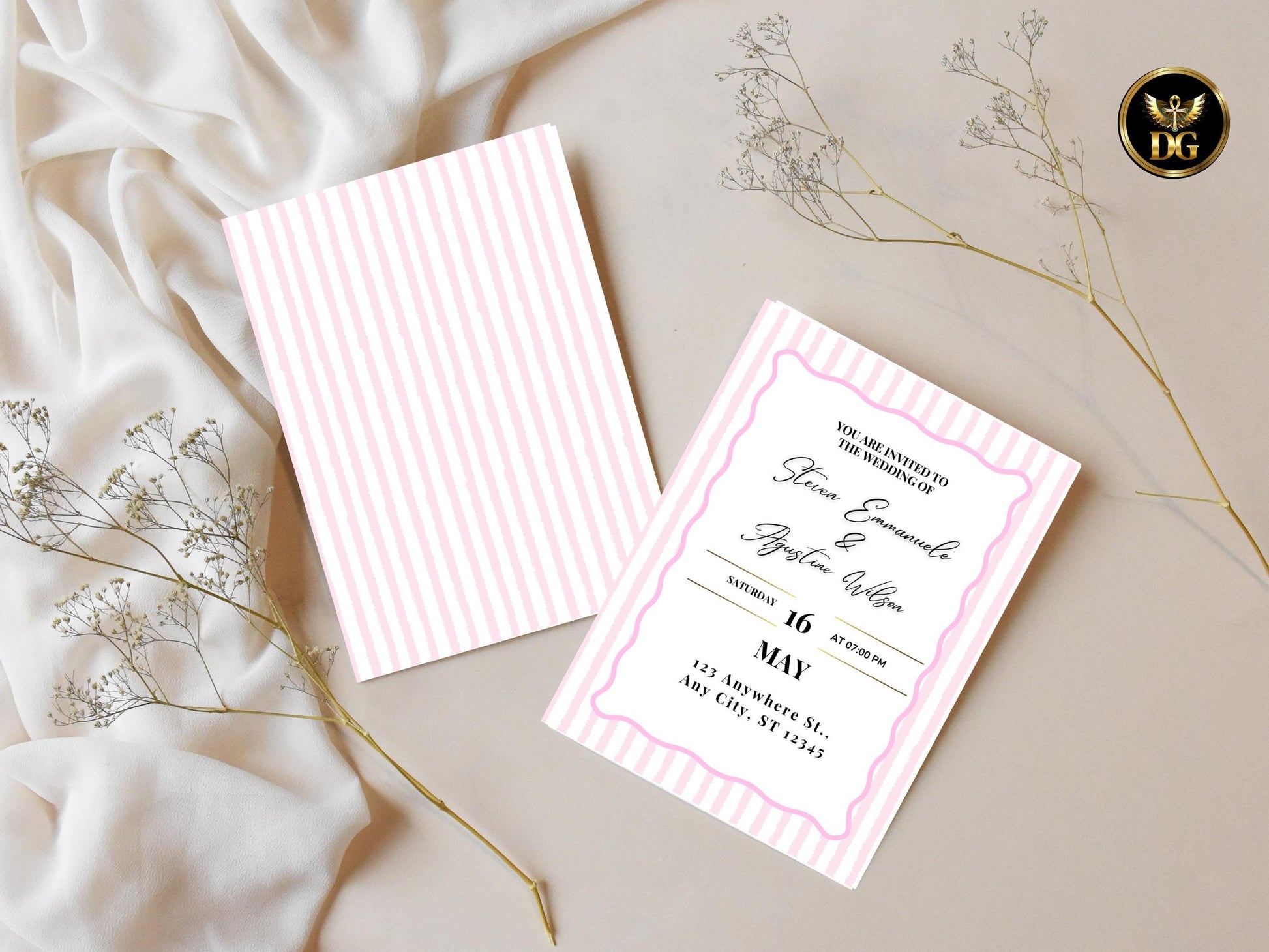 Celebrate your special day with this timeless pink wedding invitation suite. This modern yet classic set includes a wedding invitation, RSVP card, details card, and a matching back design—fully editable in Canva. Easily personalize the wording, fonts, and colors to create a wedding stationery set that perfectly matches your style.