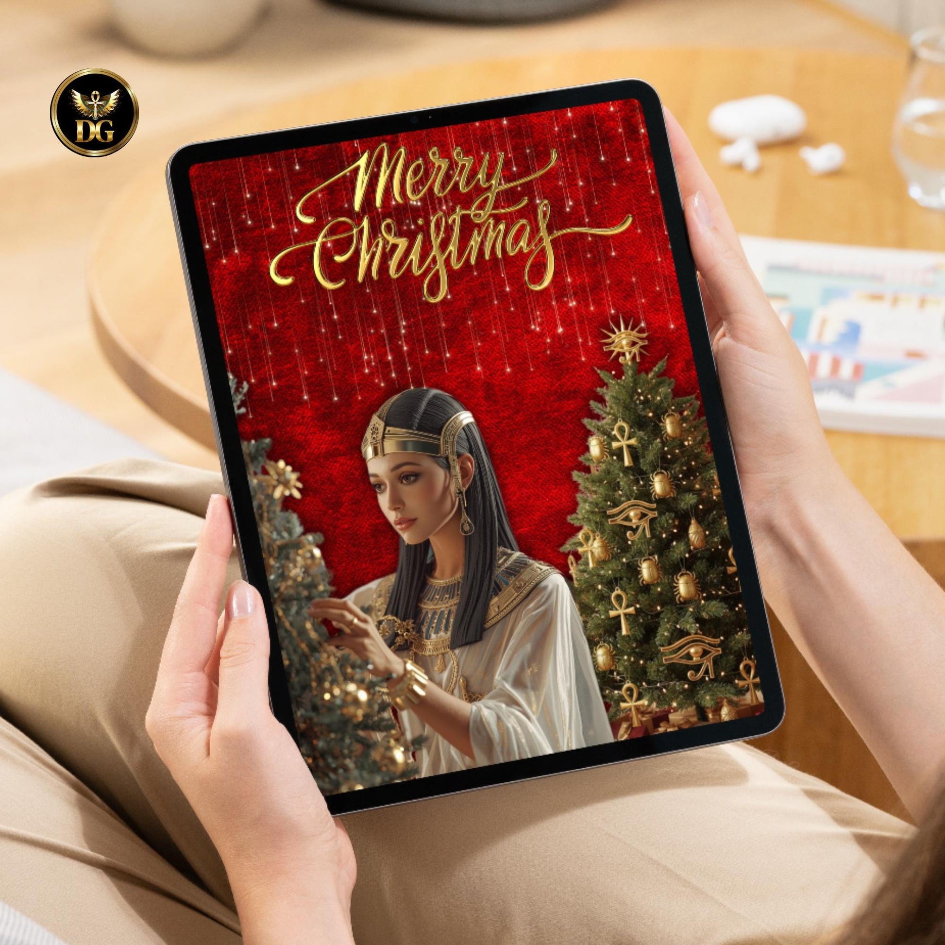 This stunning bundle features a gorgeous Pharaoh Queen decorating Christmas trees, surrounded by golden ankh ornaments, scarab baubles, lotus lights & pyramids on the tree. Rich velvet-red, deep Christmas red, blush pink, icy blue & shimmering gold backgrounds make every card feel like ancient treasure.