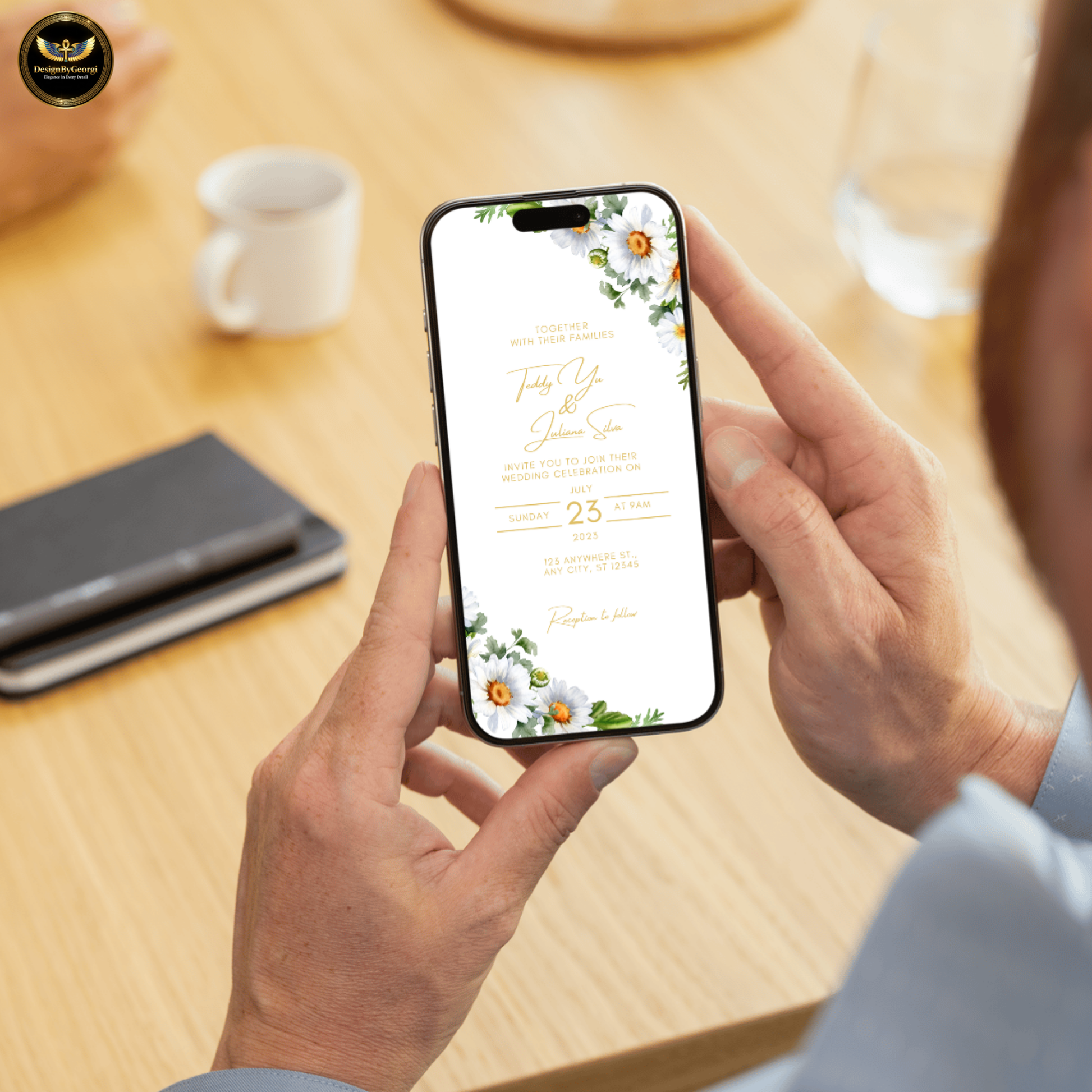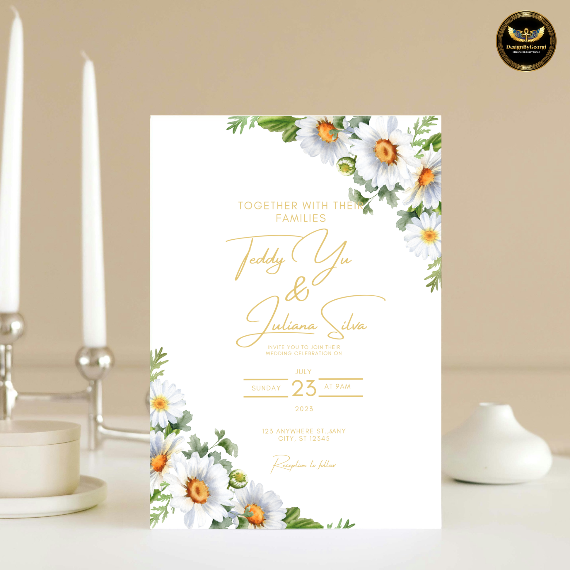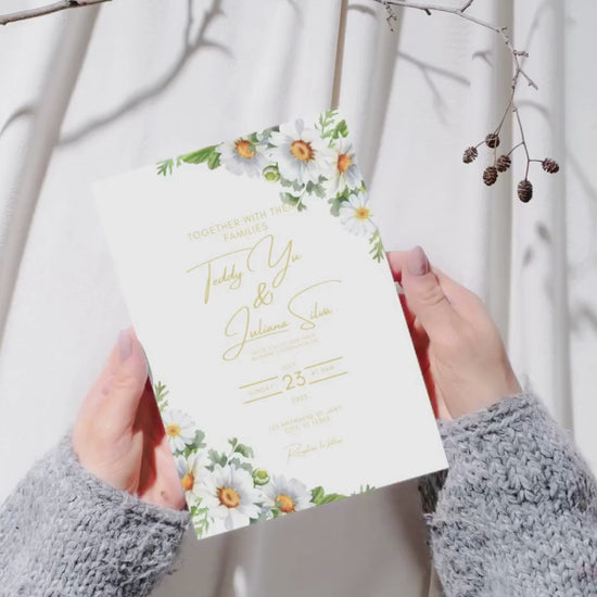 Main Wedding Invitation: 5x7 inches + digital size 1080x1920px – Crisp white background, elegant daisy in the corner, minimal design.