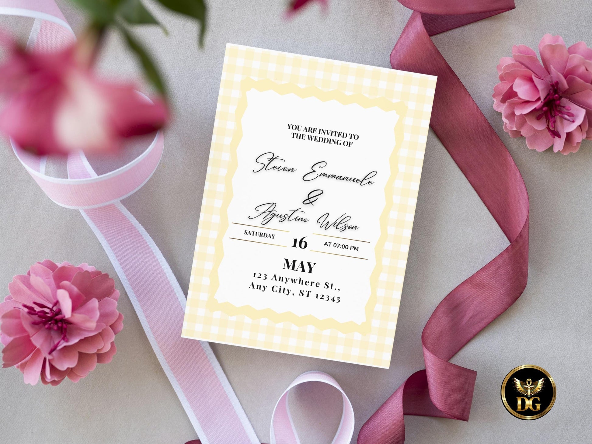 Yellow Plaid Wedding Invitation Suite | Minimalist Checkered Wedding Template with RSVP & Details | Printable Digital Download
